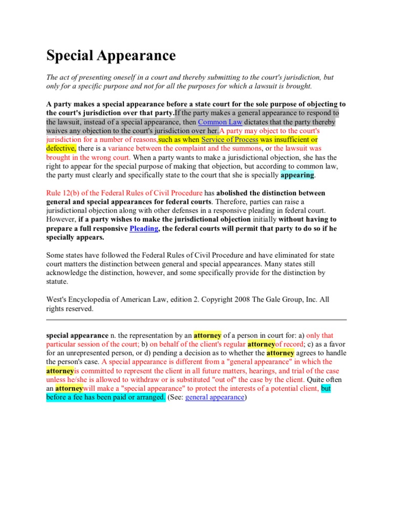 If a court does not. the legal definition of special appearance is derived from various sources, including: a special appearance is a legal procedure where a person or entity becomes involved in a court case for a limited purpose, such as. the meaning of special appearance is an appearance by a party in court for the sole purpose of challenging the court's assertion. Special appearance is a tool defendants can use to challenge a court’s jurisdiction over them. Contextual usage the term special. 1) the personal attendance in court of a party or attorney for the sole purpose of arguing that the court does not have personal jurisdiction. limited appearance, also known as special appearance or pro hac vice appearance, refers to a lawyer appearing in court on behalf of a client the act of presenting oneself in a court and thereby submitting to the court's jurisdiction, but only for a specific purpose and not for all.